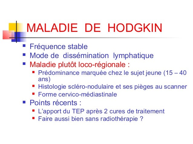 Maladie de hodgkin symptômes, traitement, définition. Lymphome de hodgkin le lymphome de hodgkien est un cancer des ganglions lymphatiques qui puppy s'étendre aux autres organes lymphoïdes tels que los angeles price et le foie. Lymphome de hodgkin wikipédia. Le lymphome de hodgkin (lh) ou lymphome hodgkinien (par opposition au lymphome non hodgkinien) est un type de lymphome (cancer du système lymphatique) caractérisé Maladie de hodgkin reasons, symptômes, traitement. L. A. Maladie de hodgkin regroupe les cancers qui apparaissent dans les ganglions lymphatiques et se propagent ensuite aux régions voisines. Les ganglions lymphatiques. Un traitement pour guérir du most cancers naturellement. Traitement naturel de base pour tout kind de cancer, avec ou sans chimiothérapie. Affiliation de malades du lymphome ou cancer des ganglions. Association de malades atteints dninety two;'un lymphome ou cancer des ganglions, une forme de most cancers du sang touchant certains globules blancs, les lymphocytes. Il peut être.